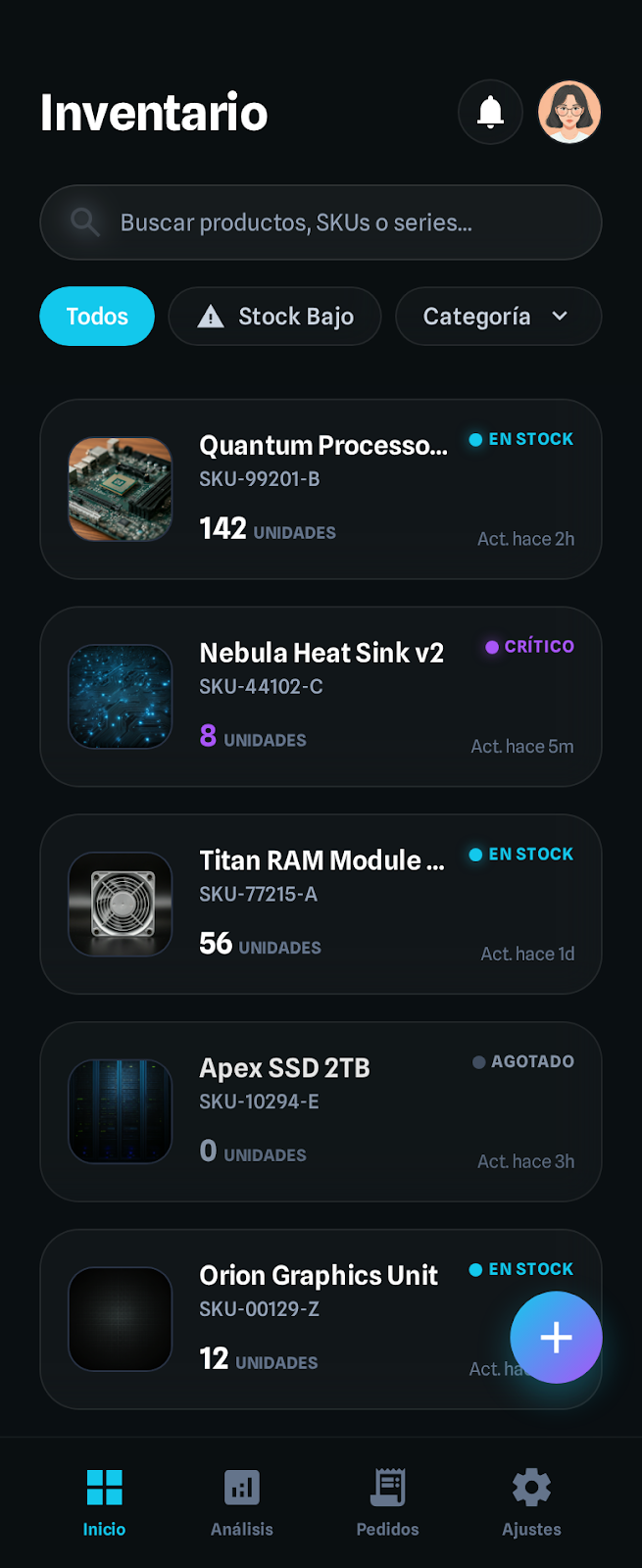 Gestión de inventario empresarial con escáner de códigos QR y alertas de stock en tiempo real.